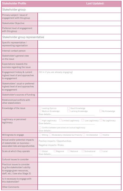ตอบ Stakeholder Profile สามารถประยุกต์ใช้ตามบริบทขององค์กรได้จาก Template ของ AA1000 ซึ่งต้องมีการทบทวนและปรับปรุงข้อมูลตลอดเวลา รายละเอียดปรากฏตามรูปภาพ ดังนี้